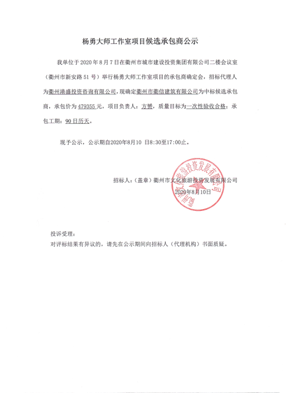楊勇大師工作室項(xiàng)目候選承包商公示