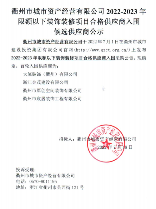 衢州市城市資產(chǎn)經(jīng)營有限公司2022-2023年限額以下裝飾裝修項目合格供應商入圍 候選供應商公示