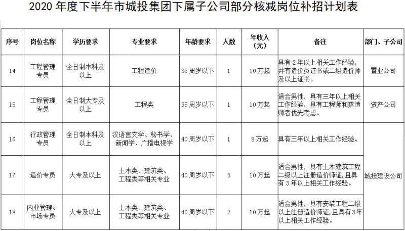 2.2020年度下半年市城投集團(tuán)下屬子公司部分核減崗位補(bǔ)招計(jì)劃表