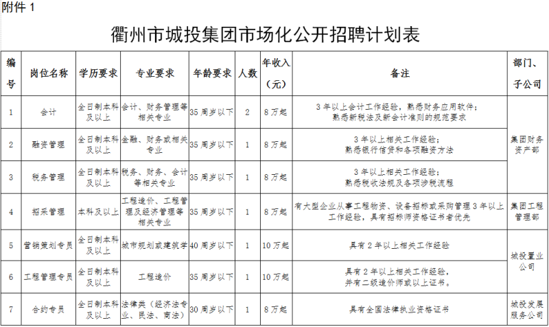 一、招聘原則堅持“公開、公平、公正、擇優(yōu)”的原則。二、招聘計劃本次面向社會公開招聘衢州市城市建設(shè)投資集團有限公司及下屬子公司國有企業(yè)工作人員共23人。具體招聘崗位、崗位(專業(yè))人數(shù)及其他條件要求詳見附表1。三、招聘條件報名者除應(yīng)符合所選聘職位的具體要求外,還應(yīng)具備以下基本條件:1.擁護中華人民共和國憲法,具有良好的思想政治素質(zhì)和保密意識。2.熱愛工作,遵紀(jì)守法,誠實守信、品行端正。3.有事業(yè)心和責(zé)任感,良好的學(xué)習(xí)能力、分析能力。4.具有勝任應(yīng)聘崗位需要的相關(guān)專業(yè)知識和工作能力,符合應(yīng)聘崗位要求的其它具體資格和條件,其中35周歲以下指1984年10月1日以后出生,其他年齡依此類推。5.身體健康,適應(yīng)崗位要求的身體條件。6.曾因犯罪受過刑事處罰的人員,曾被開除公職的人員,在公務(wù)員招考(事業(yè)單位招聘)考試中被認定實施了考試作弊、弄虛作假行為且仍在不得報考期限內(nèi)的人員,以及具有法律規(guī)定不得錄用為公務(wù)員的其他情形的人員,不得報考。7.應(yīng)聘人員不得報考與招聘單位有公務(wù)員法第六十八條所列回避情形的崗位。8.本次招聘所涉及的工作經(jīng)驗計算統(tǒng)一截止到2020年10月1日。在校就讀期間參加社會實踐、實習(xí)、兼職等不能計算為工作經(jīng)歷。9.全日制碩士研究生及以上學(xué)歷應(yīng)聘人員報考崗位專業(yè)不限,可適當(dāng)放寬條件。四、招聘程序和錄用辦法按照公開報名、資格審查、筆試、面試、體檢和考察、公示、聘用程序進行招聘。(一)報名1.報名方式:現(xiàn)場報名。2.報名時間:2020年10月21日—2020年11月3日(節(jié)假日除外,上午8:30-12:00,下午14:00-17:00)。3.報名地點:衢州市柯城區(qū)世紀(jì)大道711號(衢州市人力資源服務(wù)產(chǎn)業(yè)園一樓)。4.聯(lián)系方式:0570-3851819(程女士)、0570-3851069(徐女士)。5.注意事項:應(yīng)聘人員請佩戴口罩前往報名處,每人限報1個崗位,多報無效。應(yīng)聘人員必須對提交材料的真實性負責(zé),凡弄虛作假者,一經(jīng)查實,即取消考試資格或聘用資格。應(yīng)聘人員需攜帶本人有效身份證件、學(xué)歷(學(xué)位)證書(附學(xué)信網(wǎng)上的教育部學(xué)歷證書電子注冊備案表,留學(xué)人員應(yīng)提供教育部留學(xué)服務(wù)中心出具的國外學(xué)歷學(xué)位認證書)、工作證明(附社保單位公章的歷年社保繳費證明)、報考崗位所需的職稱證書、職業(yè)資格證書及其它相關(guān)證書原件及復(fù)印件,近期免冠1寸彩色照片1張,到現(xiàn)場報名統(tǒng)一填寫《報名登記表》。(二)資格審查報名時間截止后,由海納公司根據(jù)應(yīng)聘人員提供的資料進行資格審查,城投集團審核。(三)考試1.本次招聘原則上按照招聘計劃數(shù)與資格審查合格人數(shù)1:3比例開考,不足開考比例的按招聘計劃數(shù)3倍的崗位將酌情核減,核減情況通過相關(guān)平臺面向社會公布,不做補充報名工作。2.筆試:由海納公司統(tǒng)一組織筆試,采用閉卷形式,滿分為100分。重點考察專業(yè)理論知識掌握能力、文化素養(yǎng)、知識儲備和業(yè)務(wù)基礎(chǔ),不指定復(fù)習(xí)范圍。3.面試:根據(jù)筆試成績,每個崗位按照招聘崗位計劃數(shù)按筆試成績從高分1:4的比例從高分到低分確定面試對象。應(yīng)聘者未在規(guī)定時間內(nèi)參與面試的,視同自愿放棄面試資格,即不予遞補,不足比例的按照實際入圍人數(shù)確定。面試采用結(jié)構(gòu)化面試方式,滿分為100分,合格分為60分(低于60分為不合格),面試不合格者不予聘用。4. 因疫情原因,具體筆試、面試時間、地點另行通知。(四)體檢1.面試結(jié)束后,按筆試成績占30%、面試成績占70%的比例折合總成績,保留小數(shù)點后兩位。2.根據(jù)總成績從高分到低分按1:1確定體檢對象,總成績相同者,以筆試成績高者確定體檢對象。3.應(yīng)聘人員不按規(guī)定時間、地點參加體檢,視作放棄體檢,取消考察和聘用資格;若有放棄體檢或體檢不合格的,則按總成績從高到低依次遞補。4.體檢由城投集團組織,因疫情原因,時間、地點另行通知。(五)考察考察工作參照考錄公務(wù)員考察標(biāo)準(zhǔn)執(zhí)行。側(cè)重于考察思想政治表現(xiàn)、道德品質(zhì)、核查檔案資料,是否有不良記錄等情況,并對應(yīng)聘人員資格條件進行復(fù)查(學(xué)歷的認證以中國高等教育學(xué)生信息網(wǎng)的信息為準(zhǔn))??疾旖Y(jié)論為不宜聘用的或在考察階段本人自動放棄聘用資格的,在面試合格人員中按總成績從高分到低分依次遞補。(六)公示聘用經(jīng)考試、體檢和考察情況擇優(yōu)確定擬聘人員,公示5個工作日無異議后,按規(guī)定程序辦理聘用手續(xù),與城投集團或其子公司簽訂勞動合同。五、崗位待遇聘用人員試用期為3個月,試用期滿考核合格的,予以正式聘用,不合格的取消聘用。試用期內(nèi)按照國家規(guī)定繳納社會保險和住房公積金,試用期工資按正常工資80%發(fā)放。特別說明:因疫情防控需要,招考過程中可能需要應(yīng)聘者提供健康碼、國務(wù)院行程碼等,請各位應(yīng)聘者予以配合,具體根據(jù)疫情情況而定。