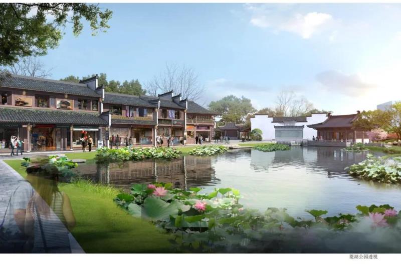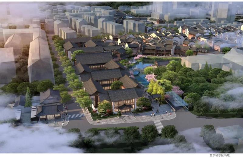 區(qū)塊三處于鐘樓和南孔家廟之間,建筑總面積約28000㎡,區(qū)塊內(nèi)文化展示以儒學文化為主題,形成文化體驗研學教育旅游觀光于一體的文化展示區(qū)。設計中亦植入了關于菱湖的歷史記憶,在該區(qū)塊東部區(qū)域展示了大片湖面,建筑上采用宋式風格,以再現(xiàn)菱湖的歷史風韻。
