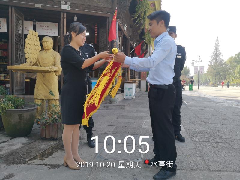 今天上午,水亭門邵永豐商鋪店長手持一面印有“情系商戶,真情服務(wù)”金色大字的錦旗送到保安隊長周國洲手上,由衷感謝街區(qū)保安隊給予的優(yōu)質(zhì)服務(wù)。