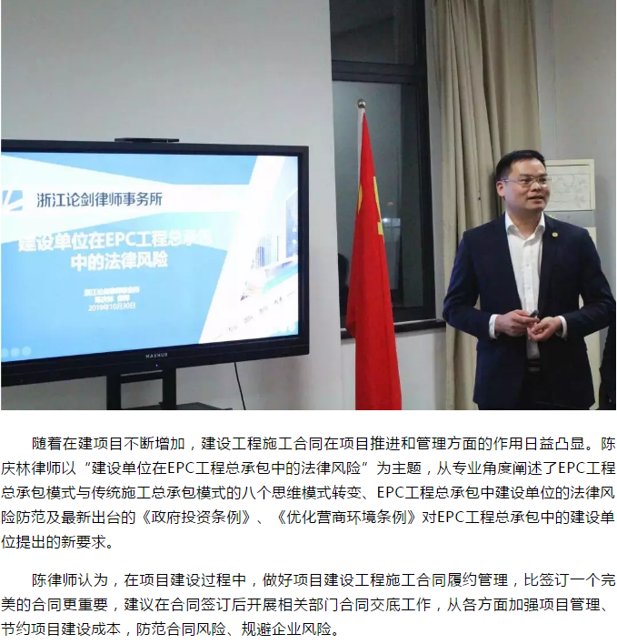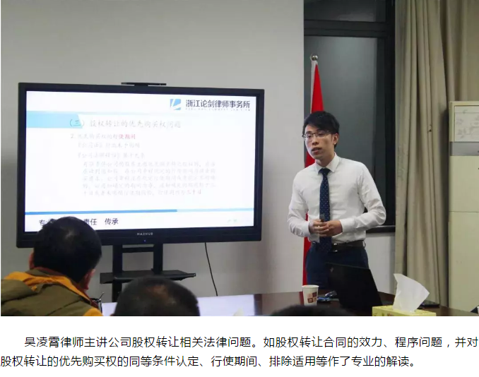 為進(jìn)一步深化風(fēng)險把控意識,提升風(fēng)險管理能力,最大程度維護(hù)集團(tuán)合法權(quán)益,10月30日晚,集團(tuán)特邀法律顧問浙江論劍律師事務(wù)所陳慶林律師團(tuán)隊,開展普法宣傳學(xué)習(xí)活動。集團(tuán)黨委書記、董事長、總經(jīng)理姜忠軍,副總經(jīng)理王堅威聆聽講座。