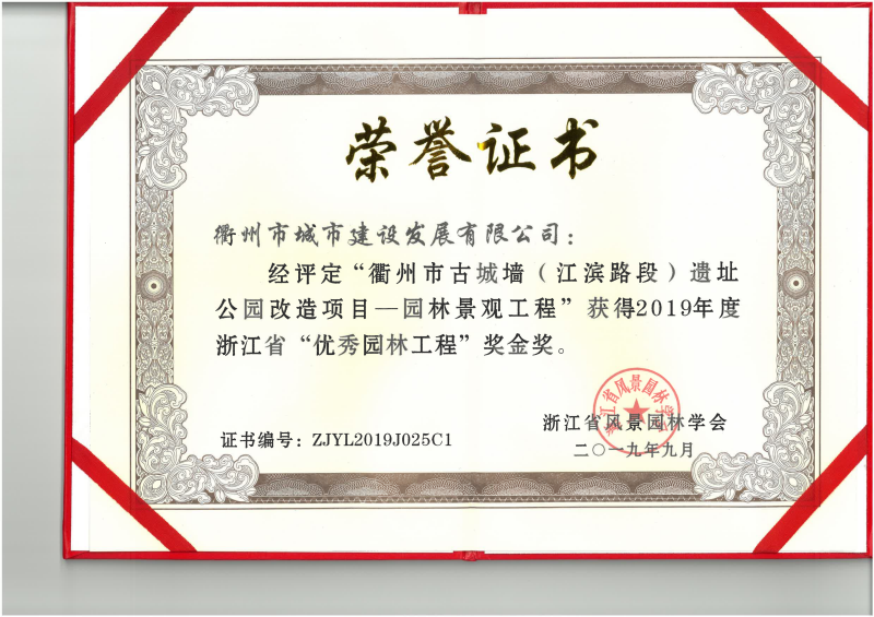 近日,由城發(fā)公司作為業(yè)主實(shí)施的衢州市古城墻(江濱路段)遺址公園改造項(xiàng)目-園林景觀工程榮獲2019年度浙江省“優(yōu)秀園林工程”獎(jiǎng)金獎(jiǎng)。