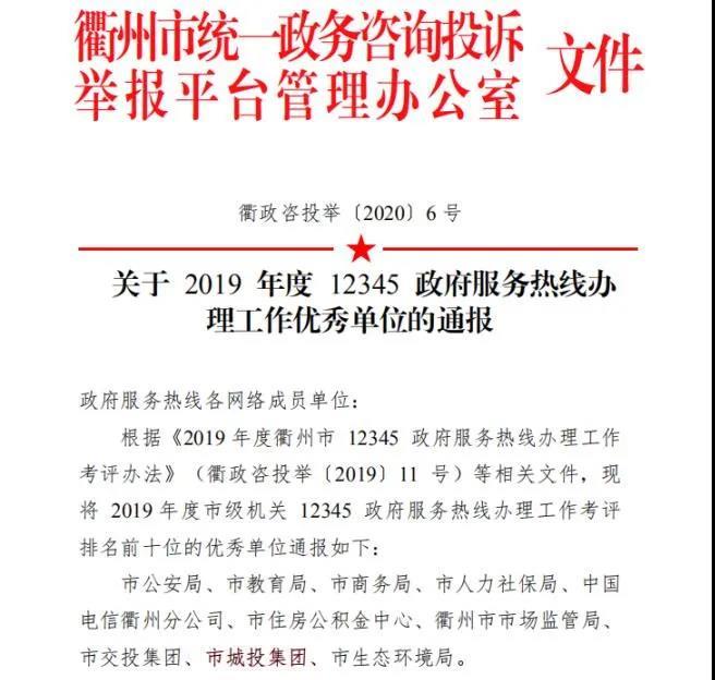 3月16日,衢州市統(tǒng)一政務咨詢投訴舉報平臺管理辦公室發(fā)布《關于2019年度衢州市政府服務熱線辦理工作優(yōu)秀單位的通報》,市城投集團榮獲“2019年度12345政府服務熱線辦理工作優(yōu)秀單位”。