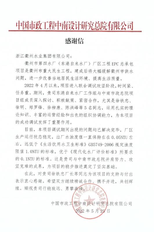 近日,市城投水業(yè)集團(tuán)收到一封中國(guó)市政工程中南設(shè)計(jì)總院有限公司發(fā)來(lái)的感謝信。信中,中國(guó)市政工程中南設(shè)計(jì)總院對(duì)市城投水業(yè)集團(tuán)東港自來(lái)水廠工作組在項(xiàng)目聯(lián)合調(diào)試階段積極獻(xiàn)策、緊密合作,為項(xiàng)目成功調(diào)試所發(fā)揮的重要作用表示了感謝。